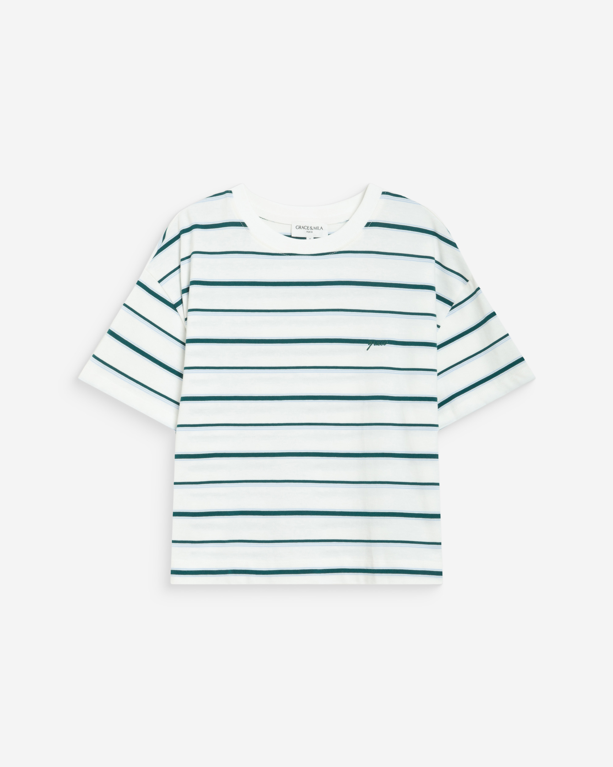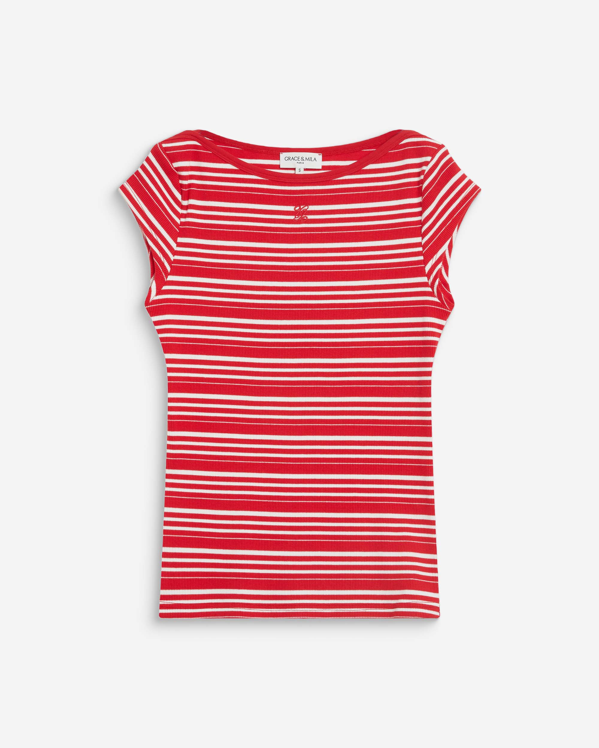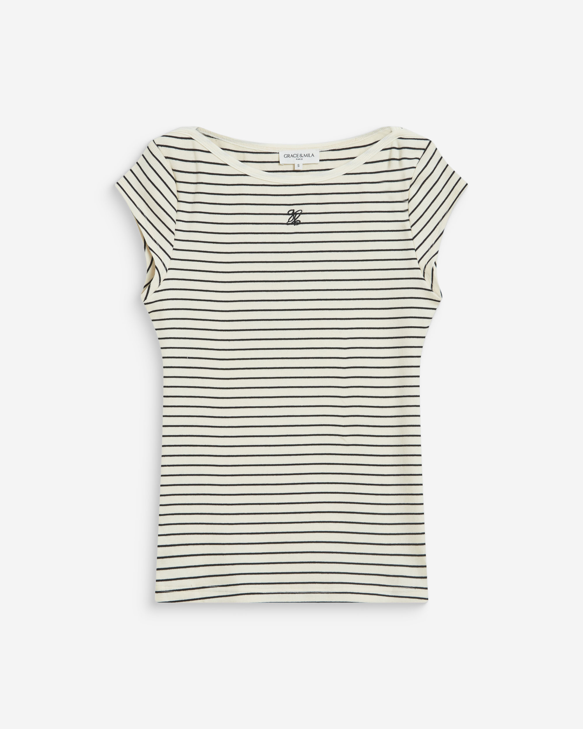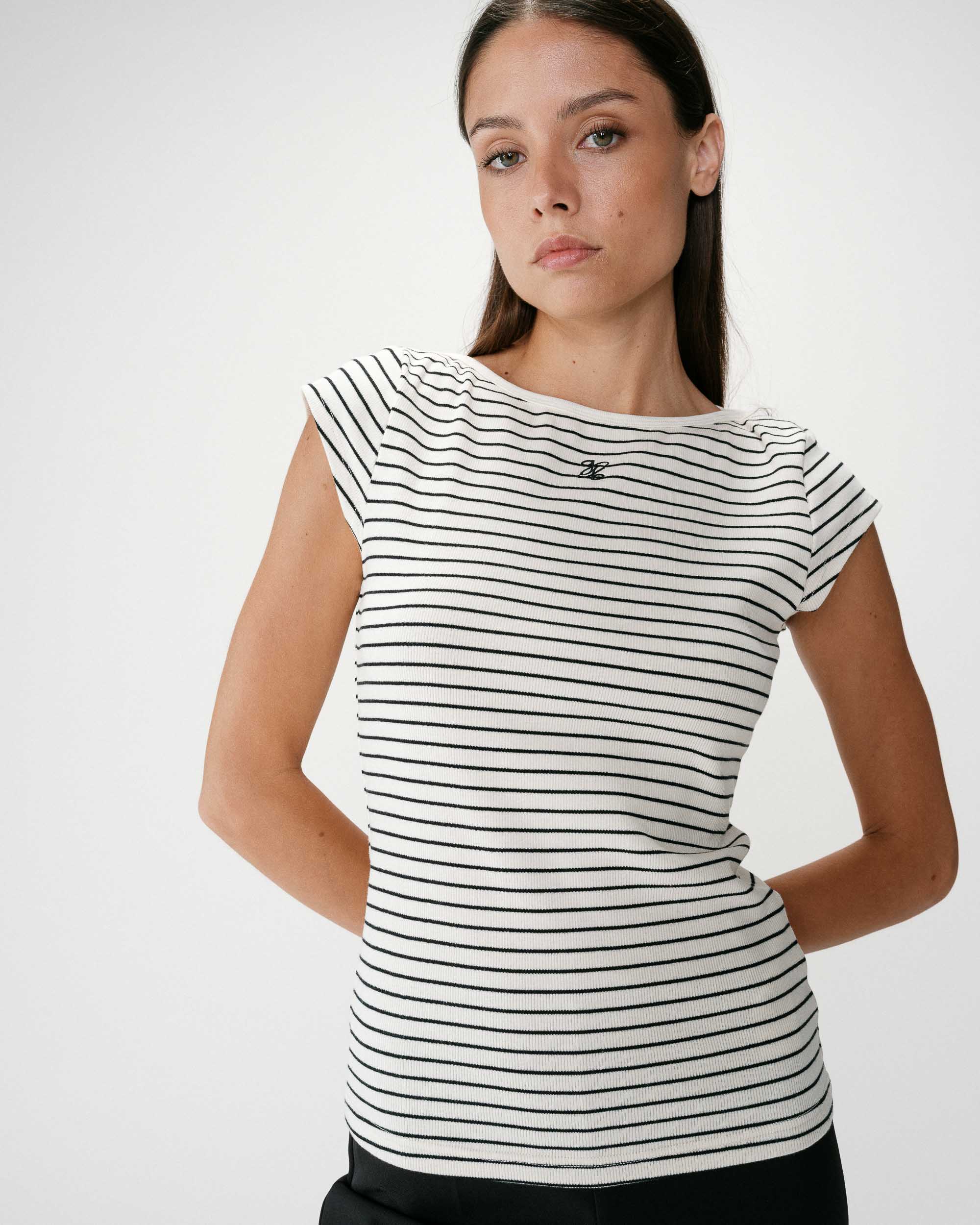 The fitted cut and boat neckline of the short-sleeve top WAKE hug and flatter the feminine curves. The model is made from striped cotton blend fabric enhanced by 'G&M' embroidery.