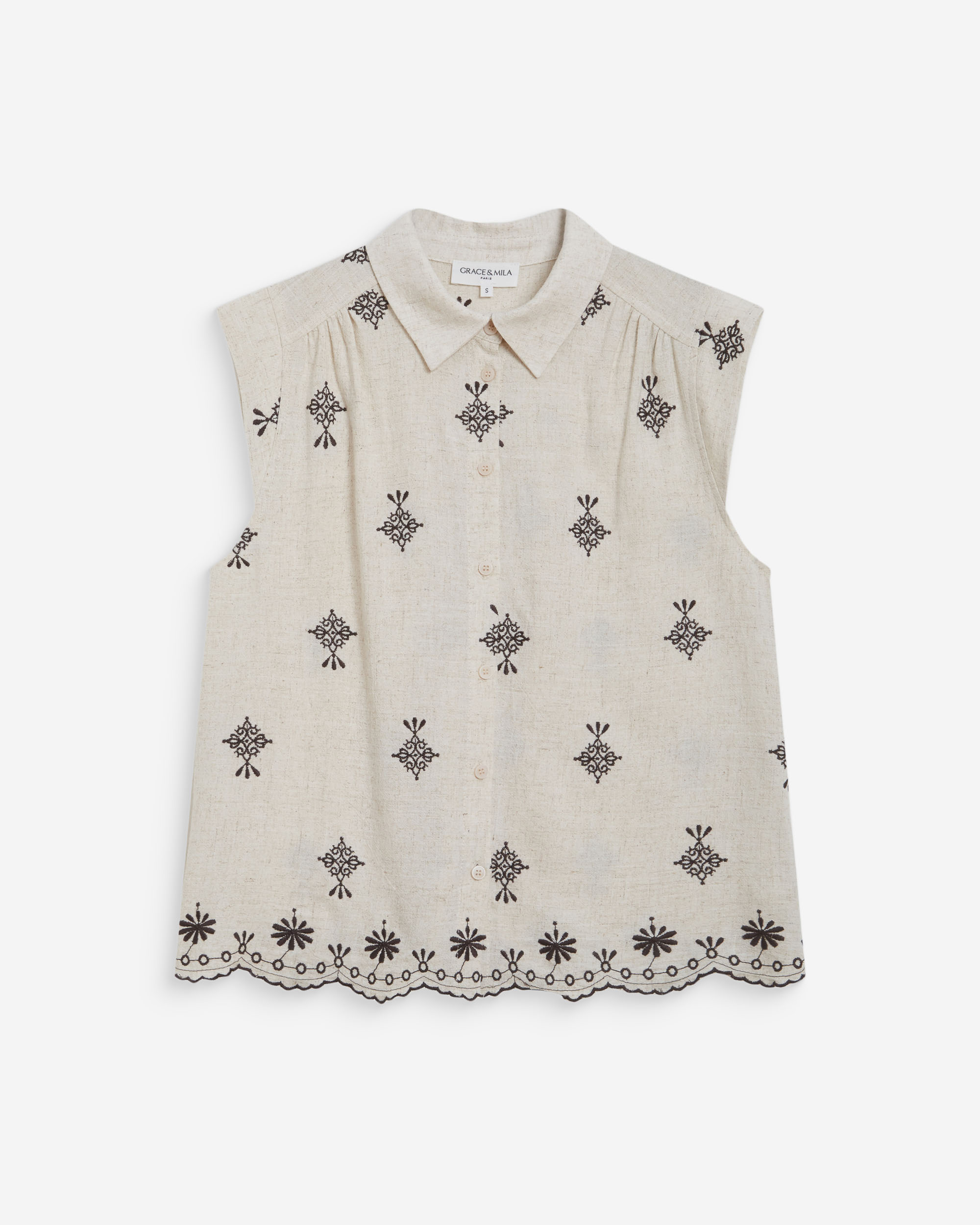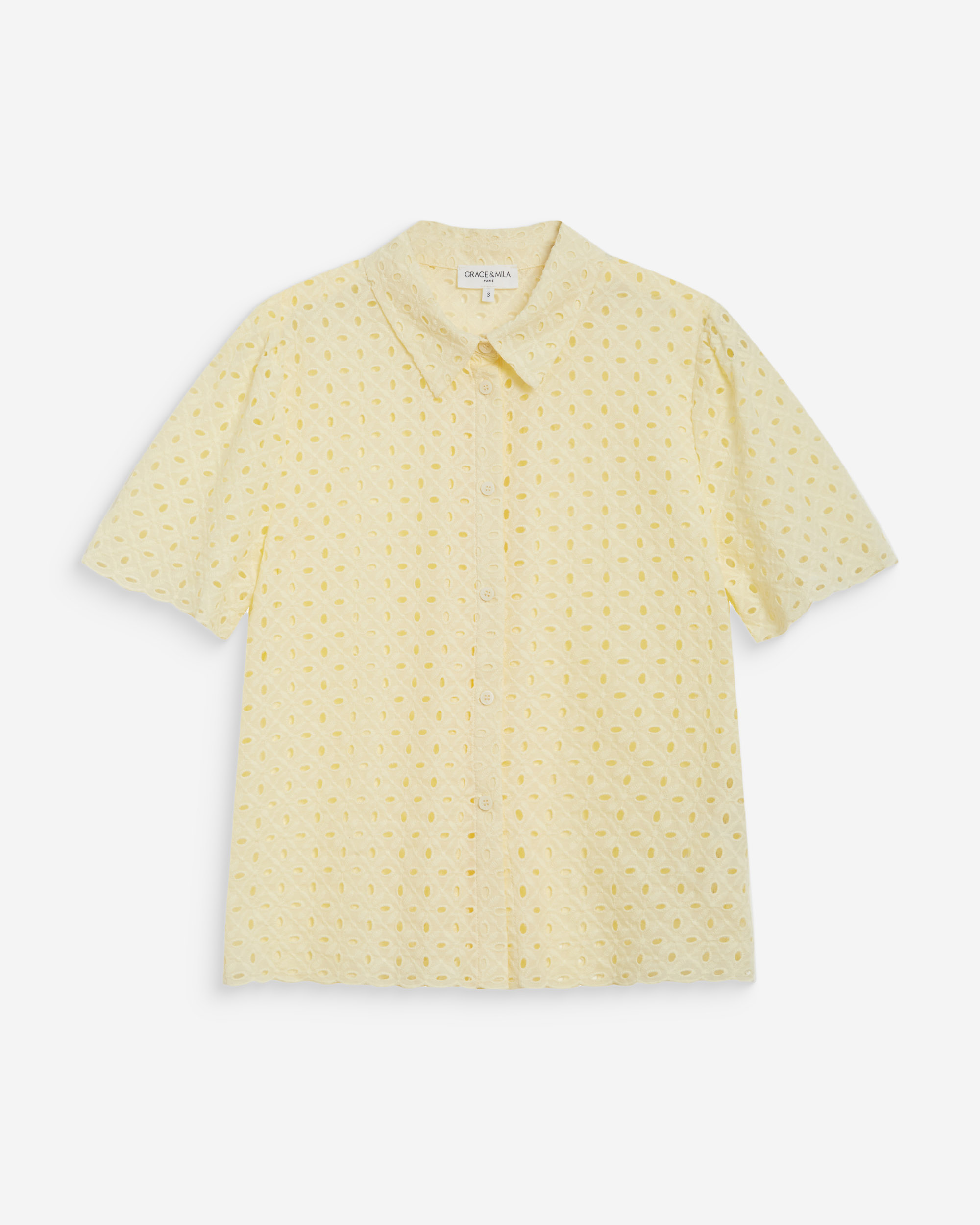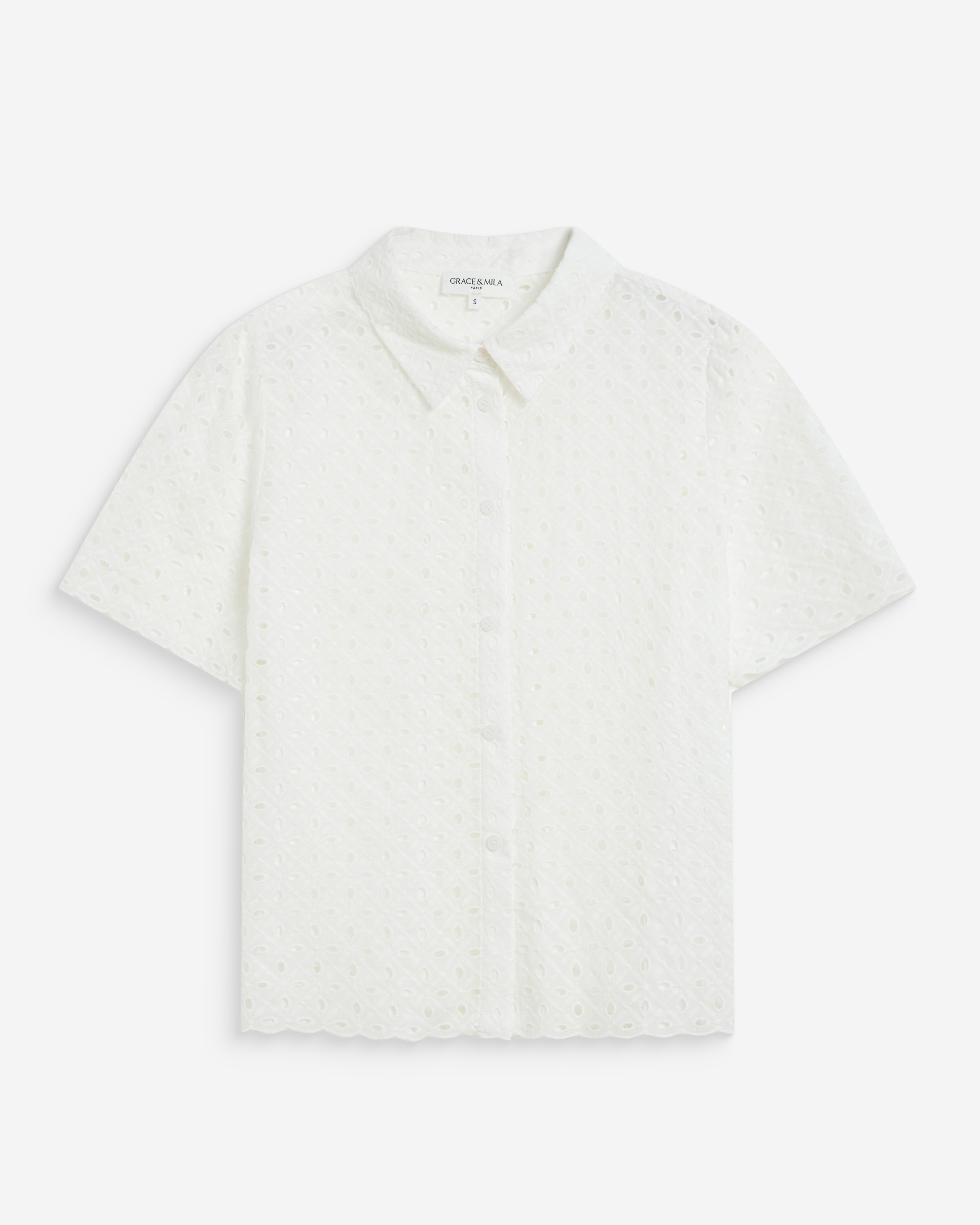 The slightly sheer VICKY blouse features short sleeves. Its V-neckline and front button placket create an elegant, timeless silhouette. \r The scalloped finishes at the collar and sleeves, along with the subtle gathers on the VICKY lace blouse, add a delicate, romantic touch.\r