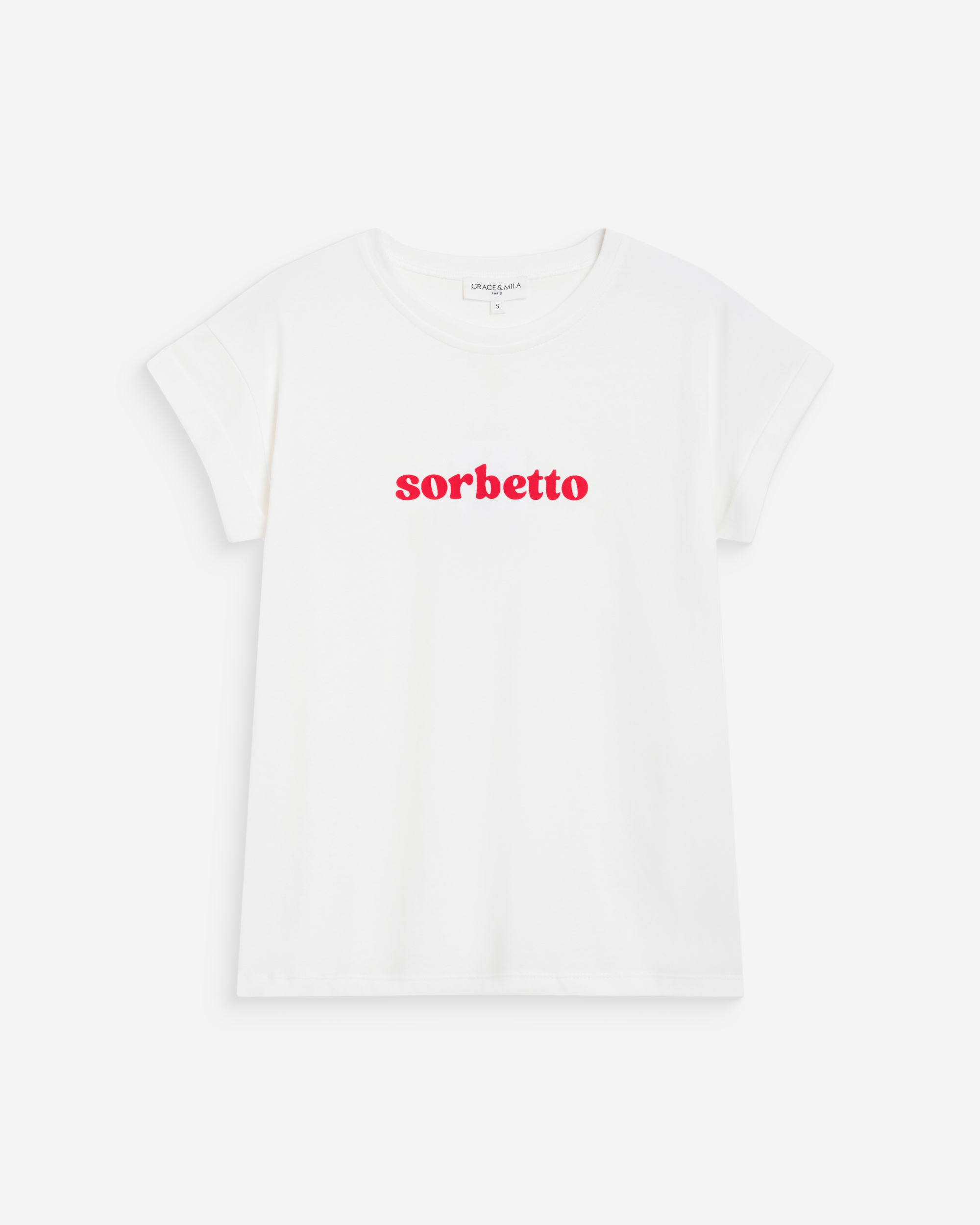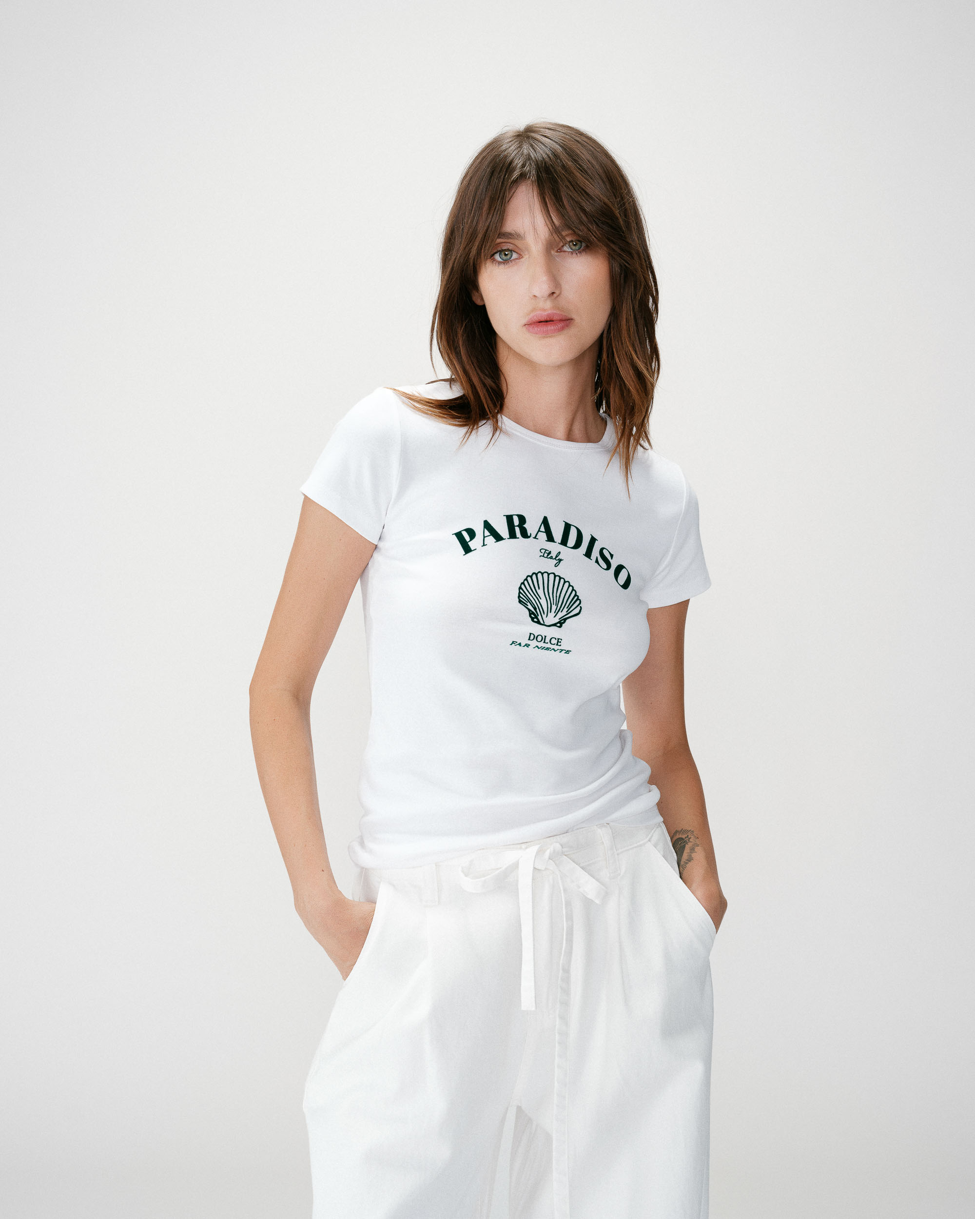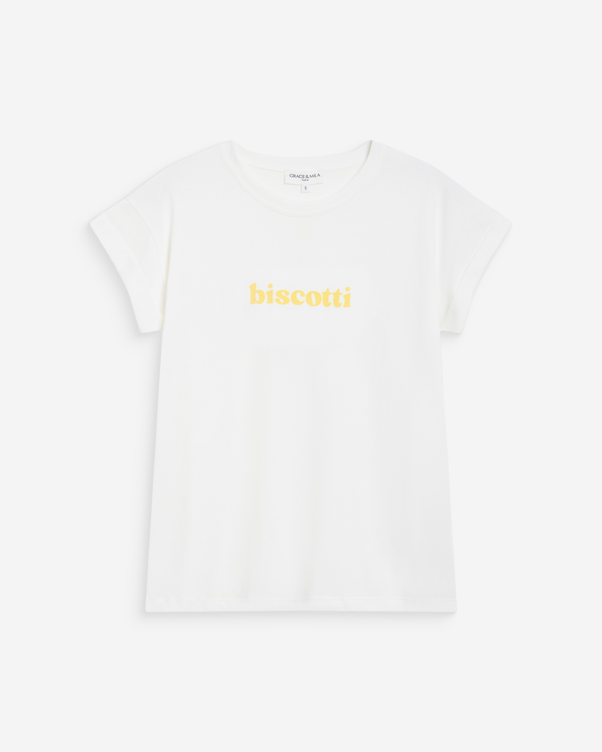 The short-sleeve t-shirt WYLO is made from 100% cotton and offers a relaxed silhouette. The model is adorned with a velvet-printed message inspired by Italian treats.