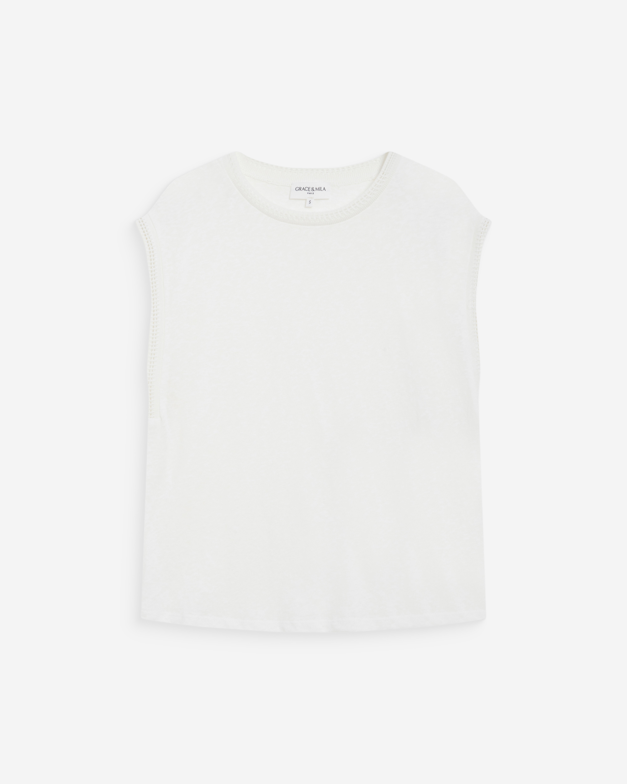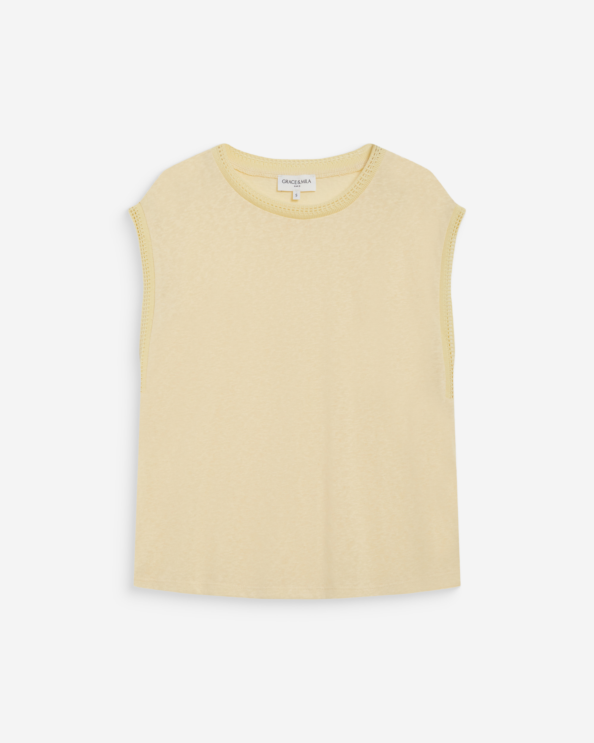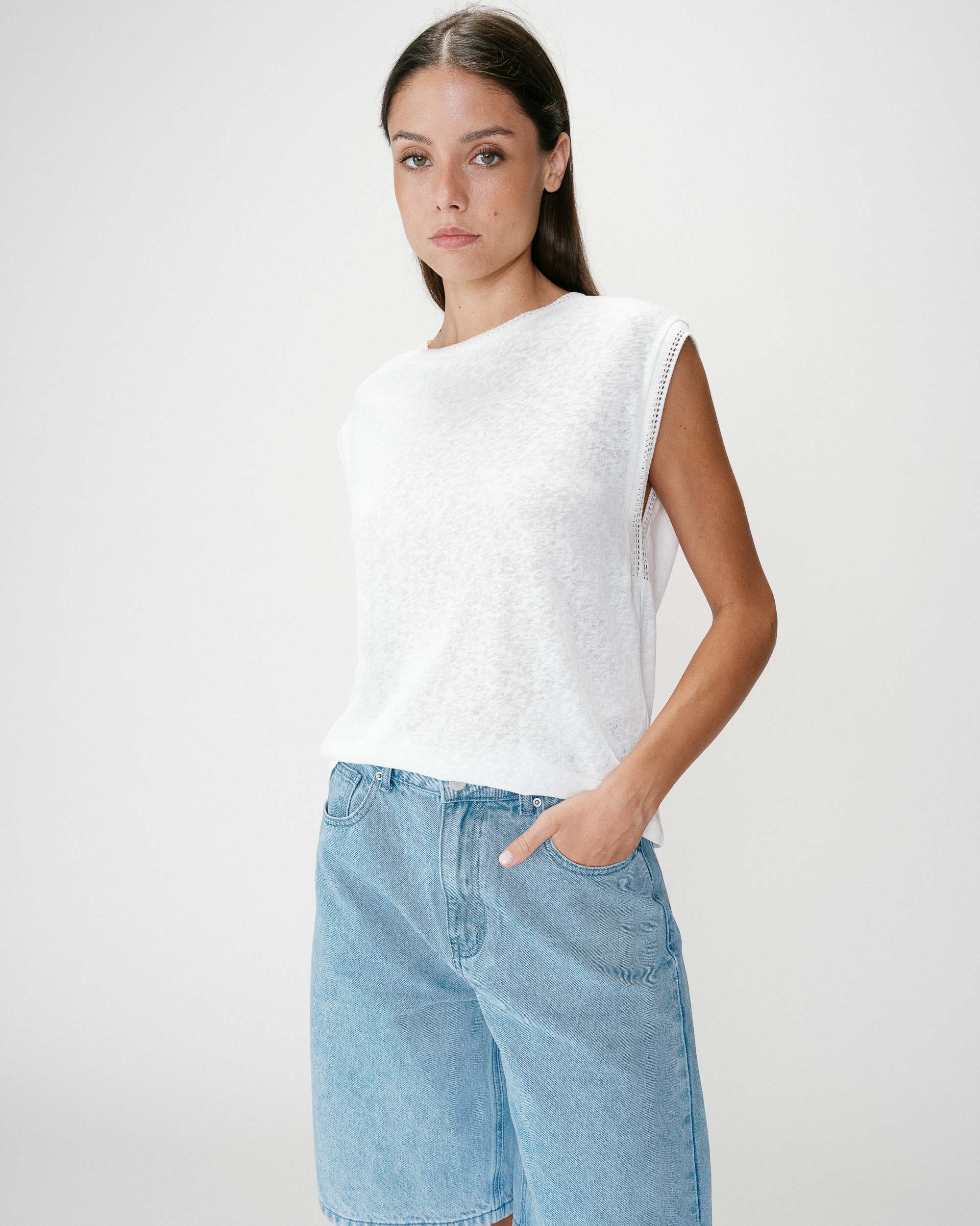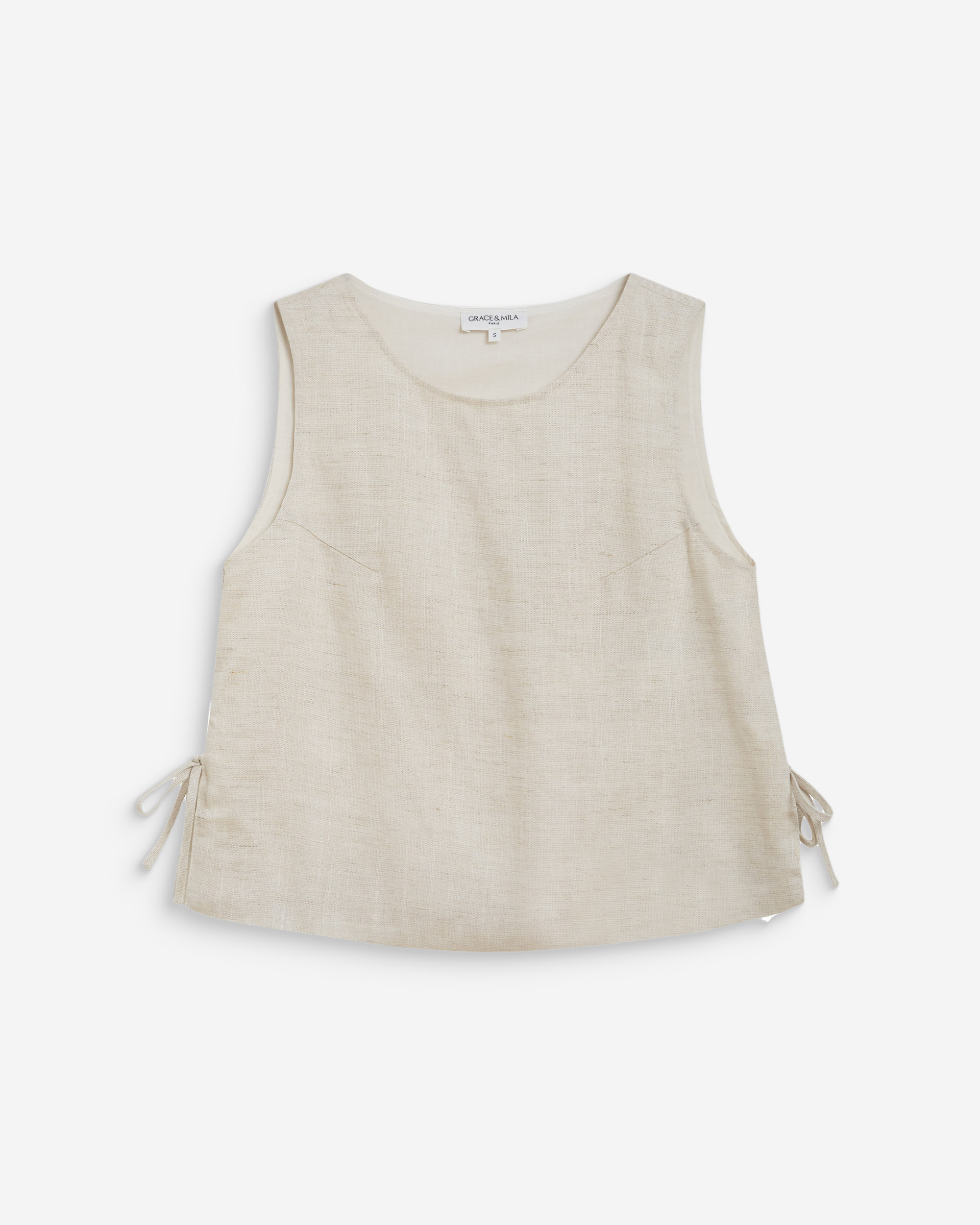 The straight cut and round neckline of the sleeveless top WESCA are enhanced with side ties. The model is made from a linen blend and offers a naturally elegant silhouette.