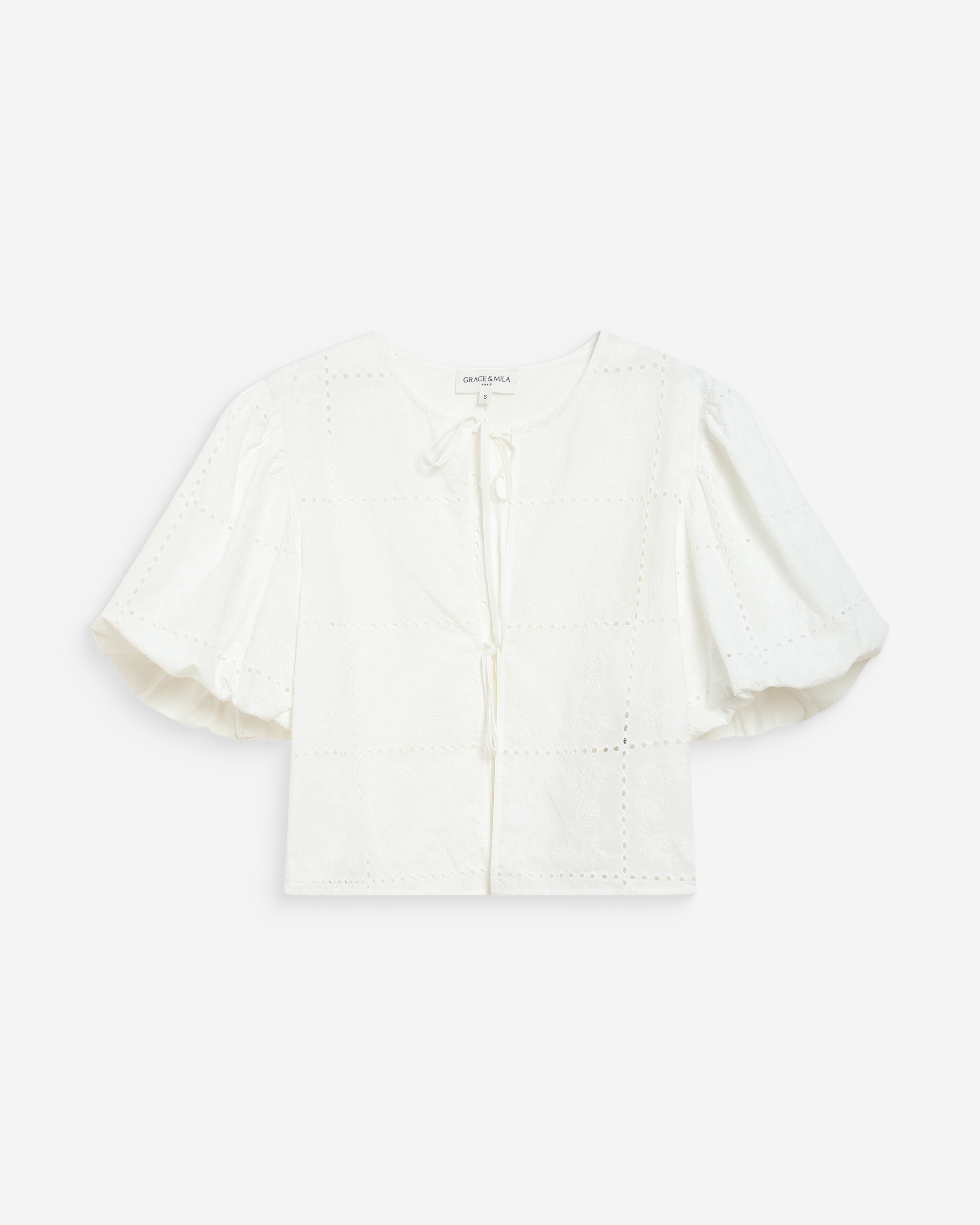 The VANDITA long-sleeve blouse reinvents eyelet embroidery and offers an elegant, romantic silhouette. The straight cut pairs with 3/4 sleeves with elasticated cuffs and a mandarin collar to create classic, refined lines. The VANDITA embroidered blouse is a feminine and sophisticated piece.