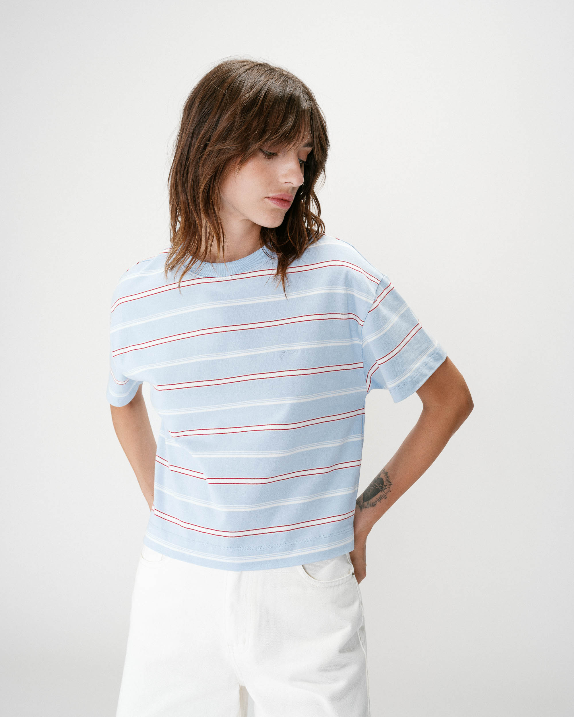 La coupe ajustée et le col bateau du top à manches courtes WAKE épousent et flattent les courbes féminines. Le modèle est confectionné dans un tissu en coton mélangé à rayures, rehaussé par une broderie 'G&M'.