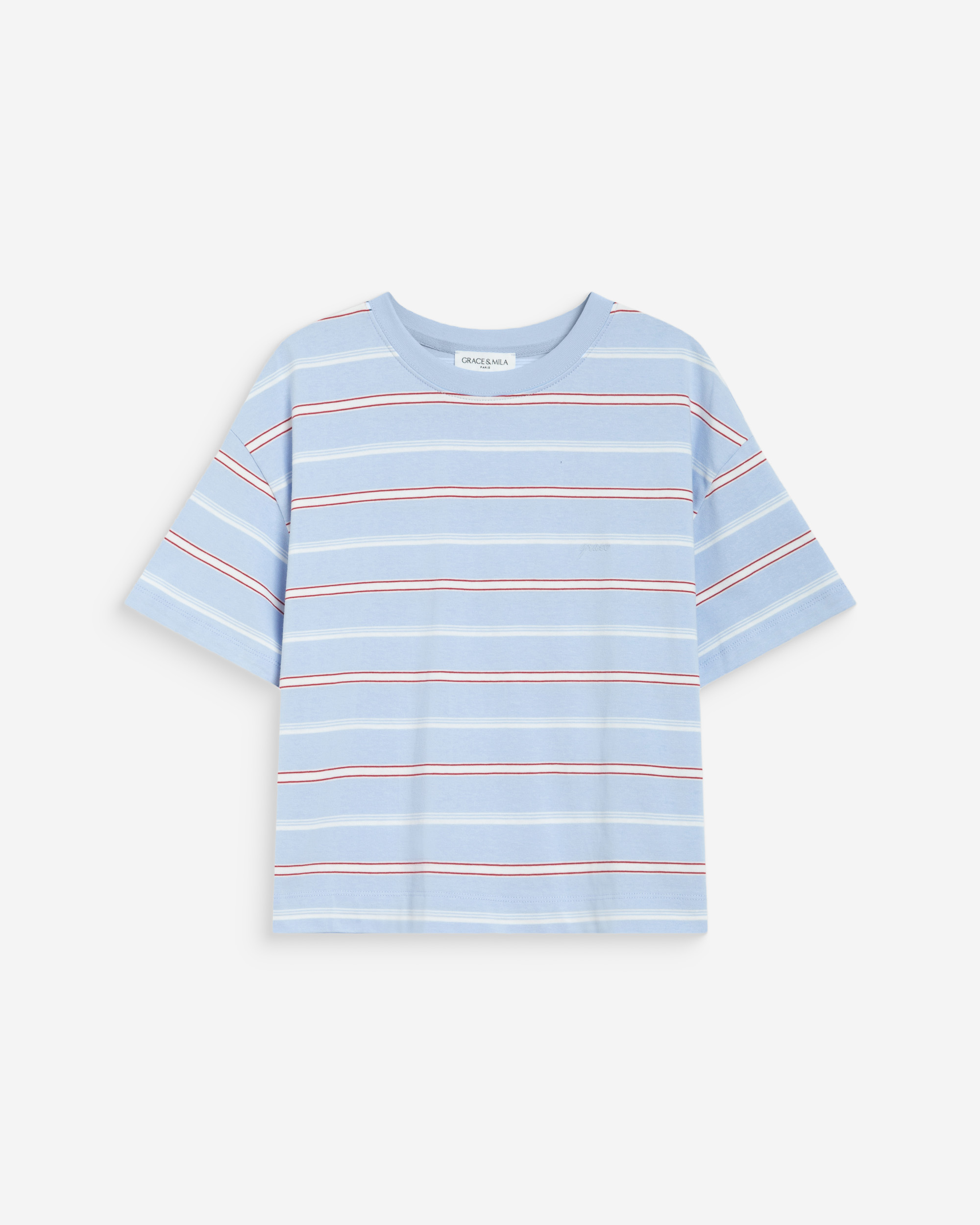 The short-sleeve t-shirt WELSON is made from a colorful striped fabric with an oversized cut for a modern and relaxed silhouette. The model has a round neckline and side slits. The 100% cotton t-shirt WELSON features a 'Grace' embroidery on the chest.
