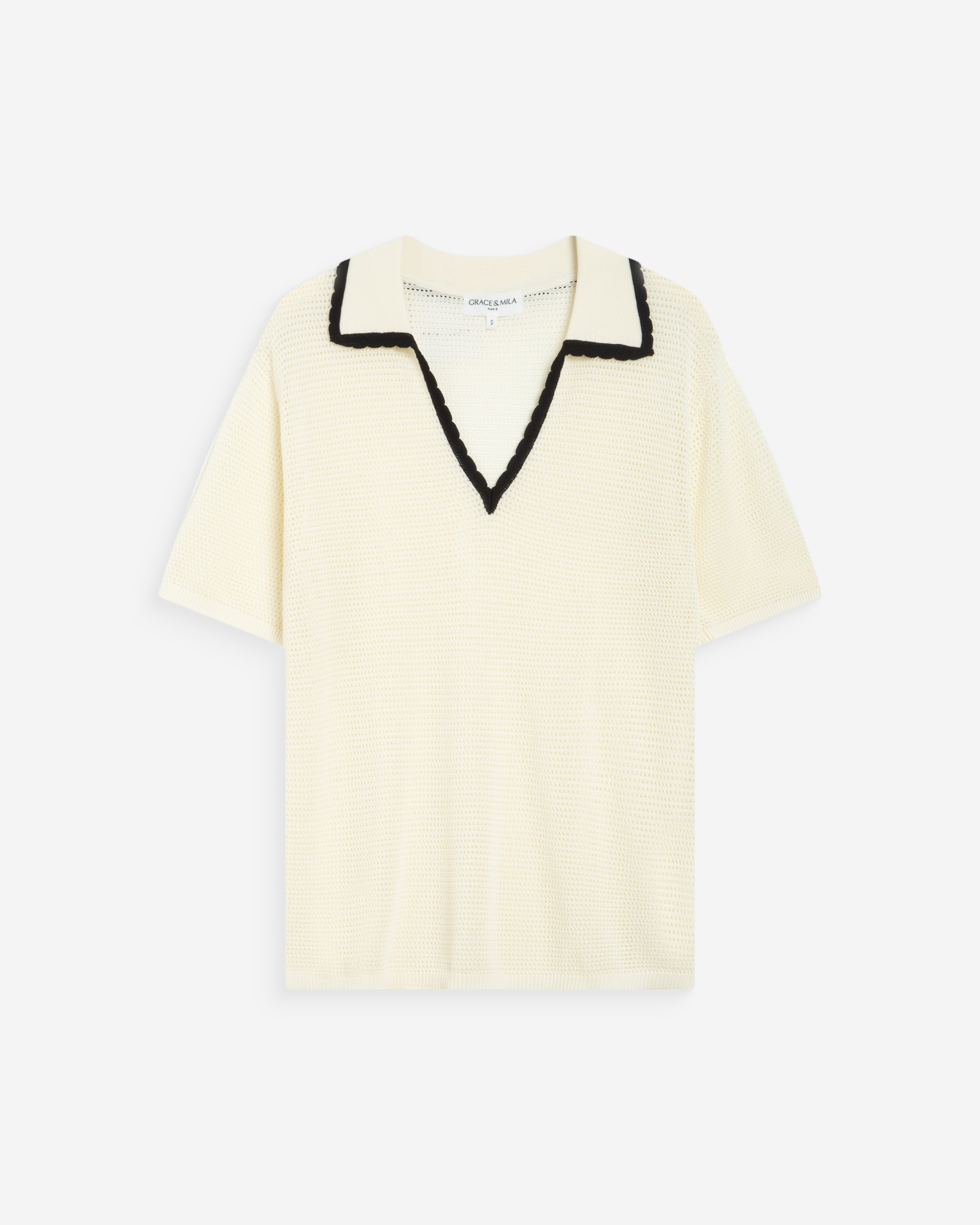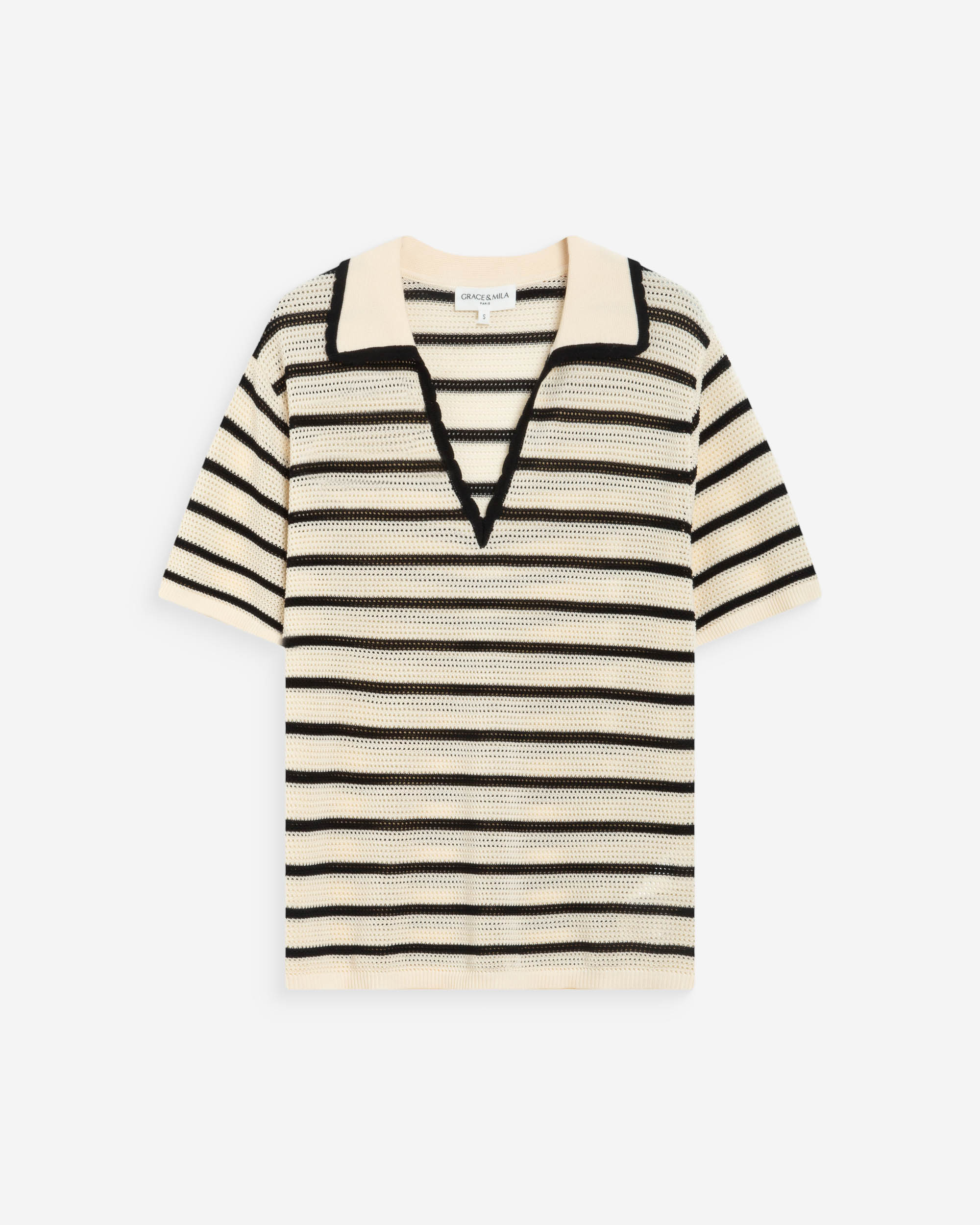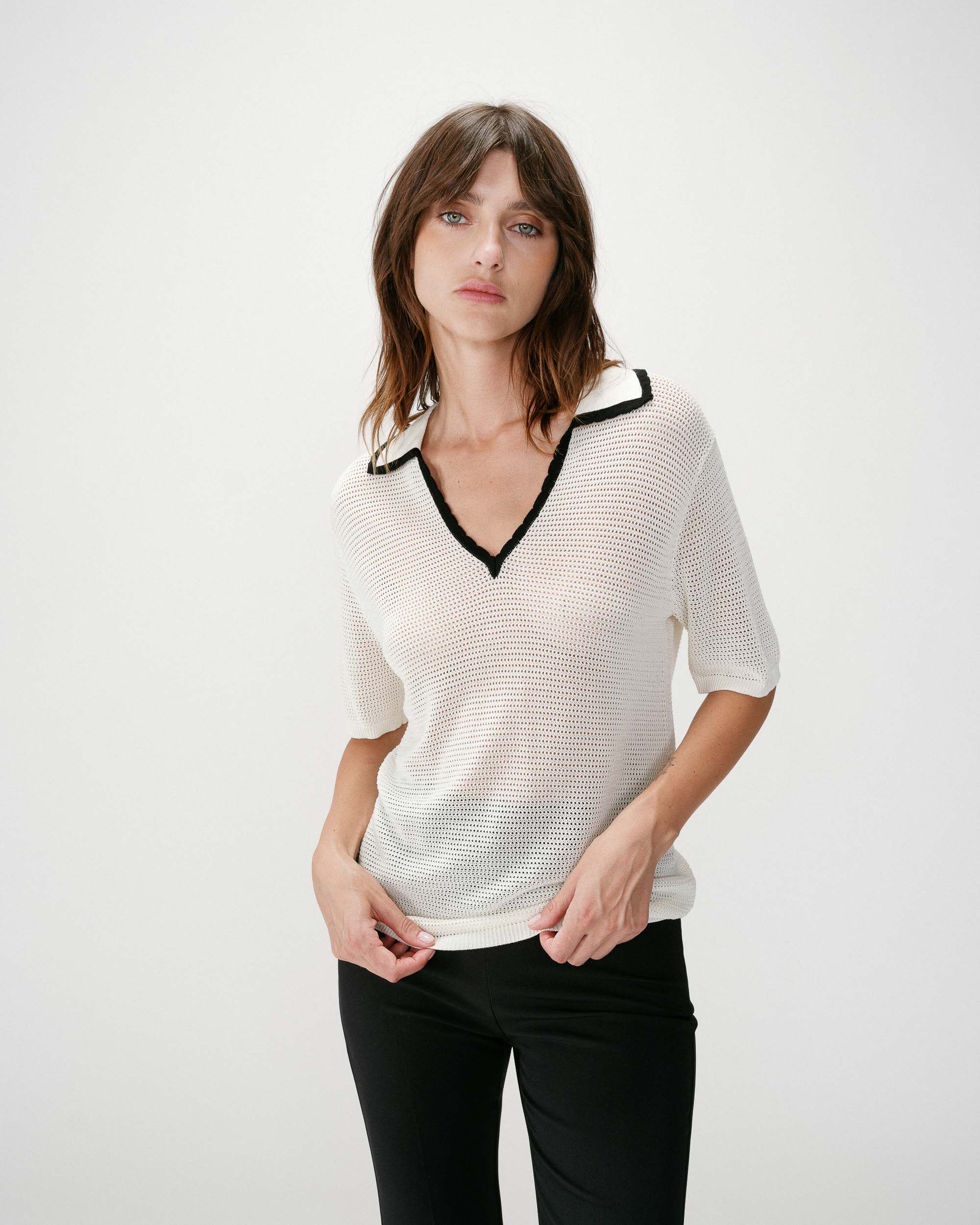 The short-sleeve polo WILMOT is made from openwork knit for a modern and chic look. Available in plain and striped versions, the model is contrasted with a black piping at the neckline.